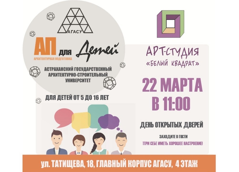 22 марта 2026 г. в 11:00 в арт-студии «Белый квадрат» АГАСУ состоится день открытых дверей.  Это отличный шанс познакомиться с нашей командой, узнать о различных творческих направлениях и попробовать себя в искусстве.